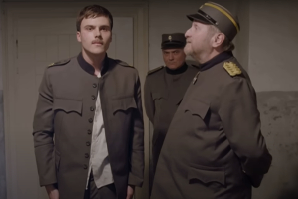 Kolona partizana na platnu, kip prkosnog revolucionara, siva betonska višespratnica…
