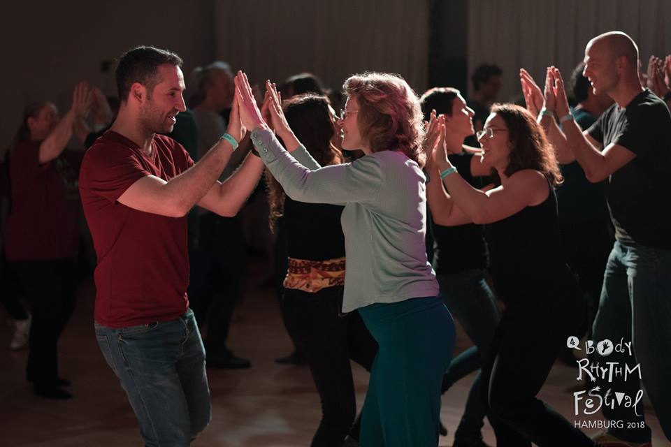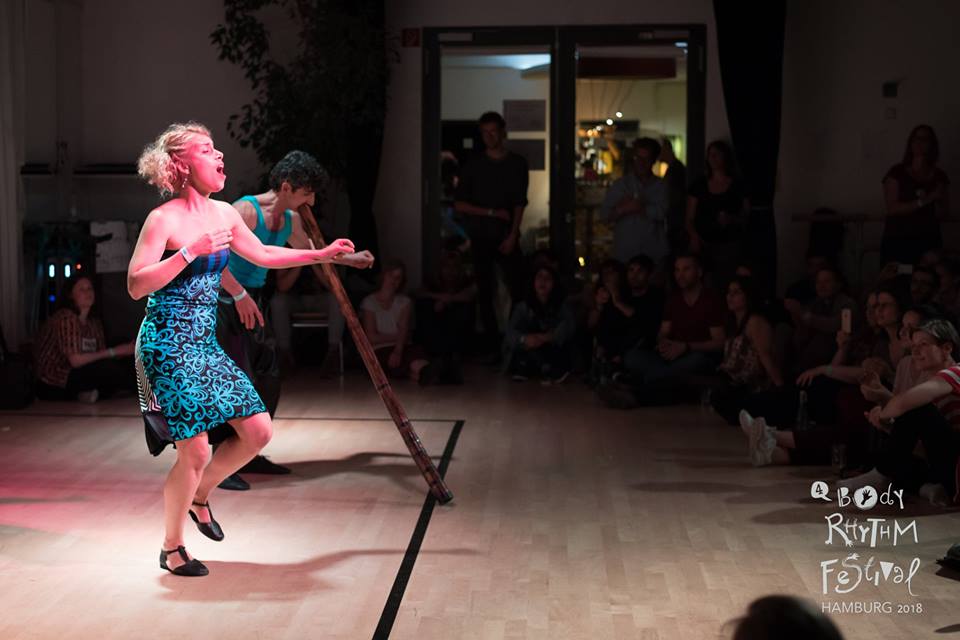 Prve večeri pred nama je izazov „Otvorene scene“ (Open stage), na koju smo se prijavili još preko formulara na sajtu, željni da pokažemo šta znamo i umemo. Toliko zanimljivih nastupa – i veći deo njih, kao i naš, kombinuje telesne perkusije, performans, ples i pesmu – ali na potpuno različite načine. Duhoviti nastupi: nemački duo plesača (i pevača), koji počinje uz muziku, kao dvoje staraca, sa štapovima za hodanje, kojima, naravno sviraju ritam. Ili dva skandinavska plesača, još jedan izuzetno duhovit nastup – nadigravanje na sceni. Nemice koje pevaju bugarske pesme uz minimalan body percussion. Slobodan sešn, potpuna improvizacija, šest izvođača iz Holandije, Nemačke i Ukrajine. Predivna publika, učesnici festivala, i divna podrška koju pružaju svakom ko se „popeo“ na scenu (koja je pravougaoni oblik obeležen crnom trakom u najvećem studiju u kojem se održavaju radionice – sa odličnim osvetljenjem).