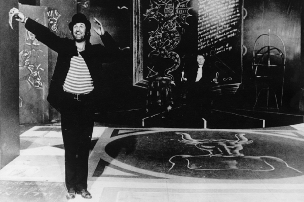 Foto: Scena iz filma Majstor i Margarita (italijansko-jugoslovenska koprodukcija, režija Aleksandar Petrović, 1972) – Velimir Bata Živojinović u ulozi Volandovog sluge Korovjeva (u pozadini je francuski glumac Alen Kini u ulozi Volanda)