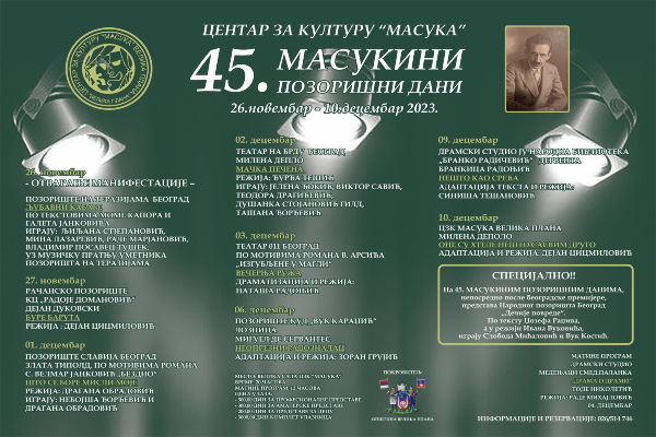 Velika Plana će od 26. novembra pa do 10. decembra 2023. godine po 45. put biti domaćin jednog od najznačajnijih pozorišnih festivala u Srbiji – Masukinih pozorišnih dana. Karakterisika ovog festivala je ta što na jednom mestu spaja profesionalne i amaterske predstave i pred publiku stavlja širok spektar likova i tema.