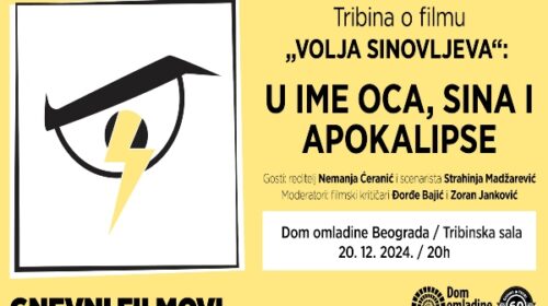 Tribina: “U IME OCA, SINA I APOKALIPSE” Petak, 20. decembar 2024. u 20:00 // Tribinska sala Doma omladine Beograda Ciklus tribina: GNEVNI FILMOVI Gosti: reditelj Nemanja Ćeranić i scenarista Strahinja Madžarević Moderatori: filmski kritičari Zoran Janković i Đorđe Bajić Jubilarna, četrdeseta tribina u ciklusu „Gnevni filmovi“, posvećena je filmu „Volja sinovljeva“, epskoj avanturi nadahnutoj srpkom tradicijom. Radnja filma je smeštena u daleku, postapokaliptičnu budućnost i prati Jovana koji, putujući razrušenom zemljom u potrazi za sestrom, sreće Anđeliju, zaljubljuje se u nju i uz njenu pomoć dolazi u mitski Grad u kome će morati da odabere stranu u odlučujućoj…